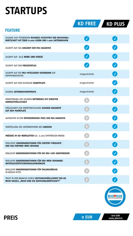 Nutzen Sie KommunalDigital mit allen Basis-Funktionen kostenfrei (KD free) oder profitieren von allen kostenpflichtigen Zusatzfunktionen (KD plus – Startups erhalten einen Preisvorteil)!