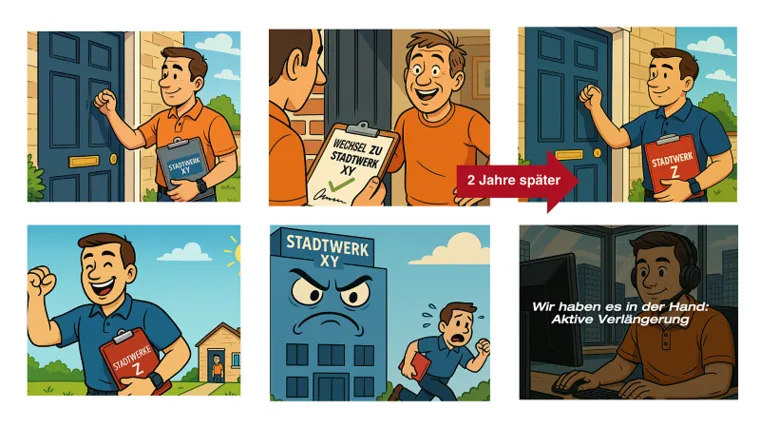 Unser Modell verbindet gezielte Neukundenakquise mit einem proaktiven Verlängerungsprozess. Neue Kund:innen werden über Direktvertrieb – bei uns durch Door-to-Door-Akquise – für das Stadtwerk gewonnen. Anstatt nach zwei Jahren erneut einen Anbieterwechsel zu riskieren, setzen wir jedoch schon sechs Monate vor Vertragsende an: Der Kunde oder die Kundin wird proaktiv kontaktiert, die Verlängerungsoption transparent erläutert und der Verbleib beim bestehenden Stadtwerk attraktiv gestaltet.