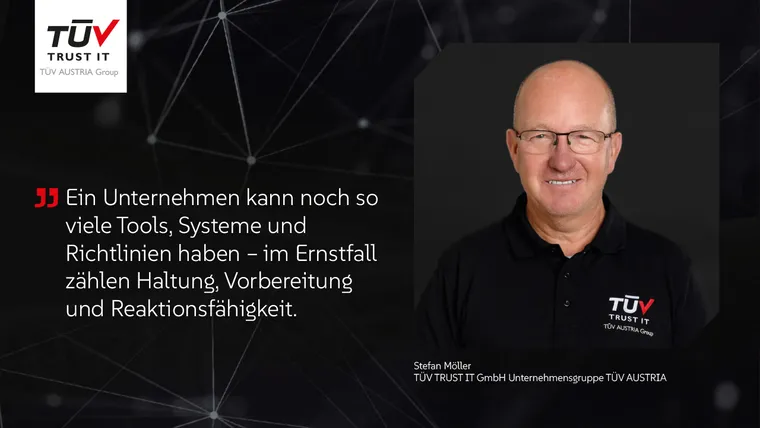 Dabei gilt für uns bei TÜV TRUST IT immer: Ein Unternehmen kann noch so viele Tools, Systeme und Richtlinien haben – im Ernstfall zählen Haltung, Vorbereitung und Reaktionsfähigkeit. Die beste Cyberabwehr bringt nichts, wenn sie im Kopf nicht stattgefunden hat. Und das lässt sich trainieren.
