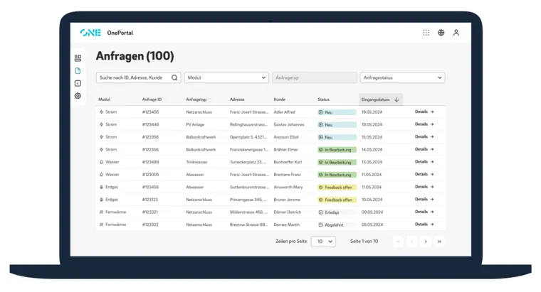 Gesagt, getan. Im Austausch mit unseren Nutzer:innen haben wir das OnePortal Anfragemanagement entwickelt – eine Webanwendung, die die Bearbeitung auf ein neues Level hebt: Alle Anfragen auf einen Blick, mit Such- und Filterfunktionen, Statusanzeigen, Exportoptionen – alles in einem klaren, intuitiven Dashboard. „Jetzt finde ich jede Anfrage in Sekunden – egal ob von gestern oder vor drei Monaten“, sagt ein Nutzer.