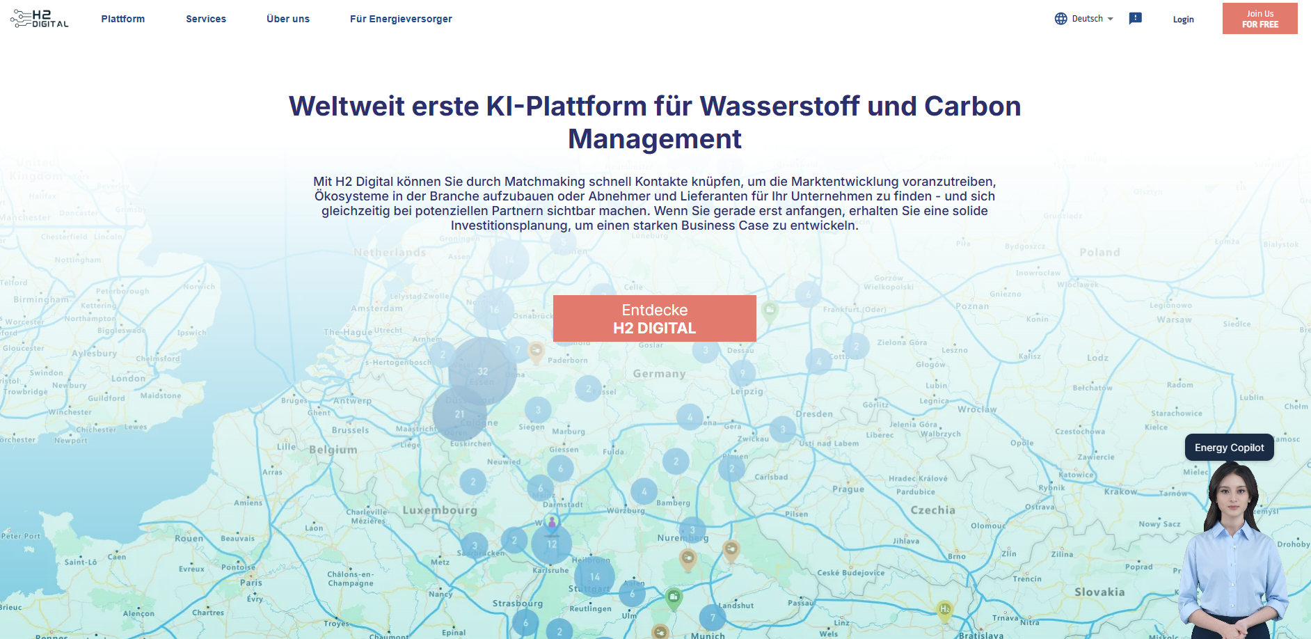 H2 Digital ist die weltweit erste KI-gestützte Plattform für grüne Moleküle & Wärme und bietet das digitale Rückgrat für die globale Energiewende. Unsere SaaS-Plattform ermöglicht Markttransparenz in Echtzeit, intelligentes Matchmaking und datengetriebene Entscheidungen, um die Einführung grüner Moleküle wie Wasserstoff und die Entwicklung der Infrastruktur zu beschleunigen.