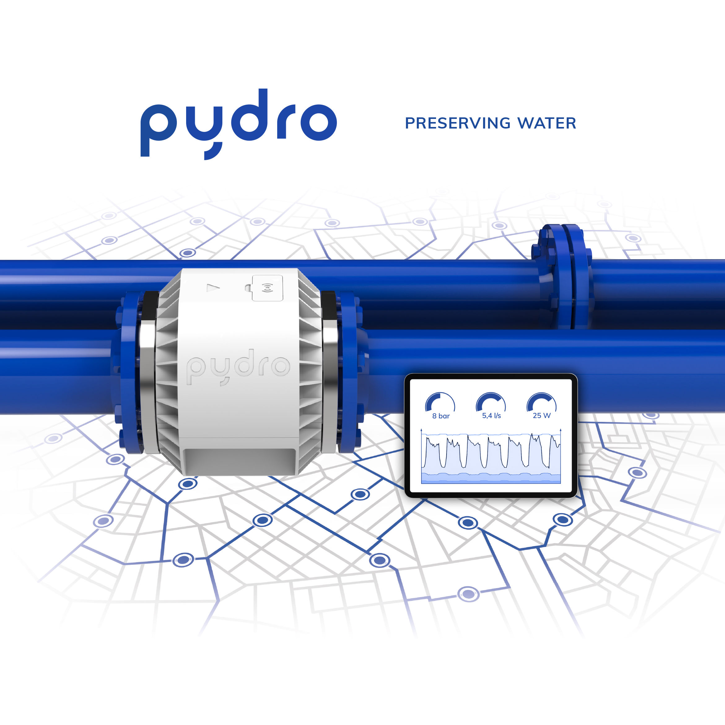 PYDRO entwickelt energieautarke Sensoren und Ventile für die intelligente Wasserinfrastruktur (Smart Water Networks). Durch den Einsatz dieser autarken Mess- und Regelungssysteme können umfangreiche Daten in Echtzeit erhoben werden, die dabei helfen Rohrbrüche und Wasserverluste zu reduzieren.